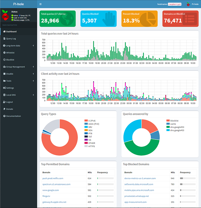 We compared and contrasted the results of the two Pi-hole instances. It seemed that both setups had pretty similar outcomes. Around 18% of ad requests were blocked at Location A and approximately 12% of total requests blocked at Location B. Pi-hole provides a lot more information in the logs, but those are the headline figures. The biggest offenders appeared to be Google ad servers, Amazon device metrics and WhatsApp data collection.